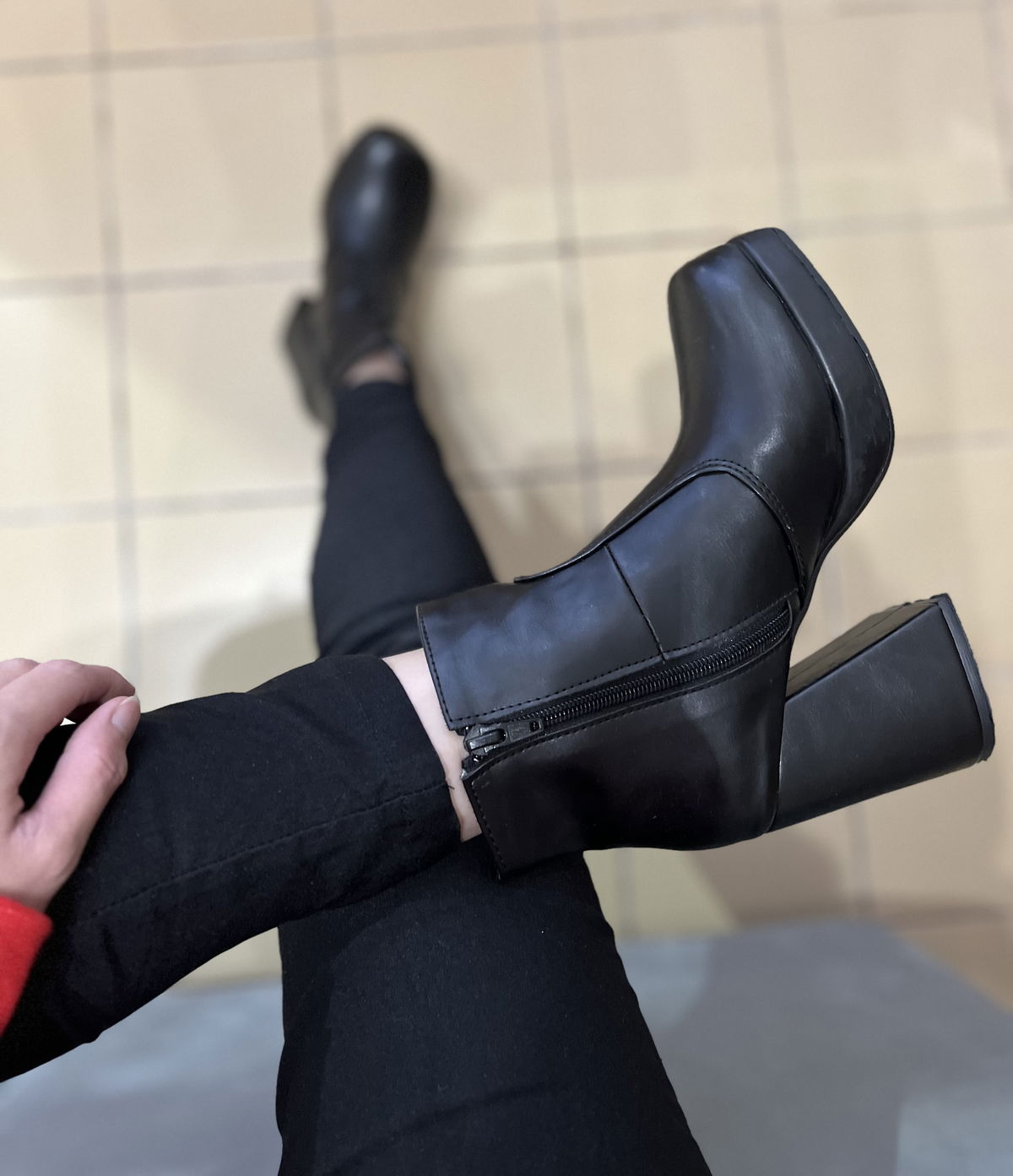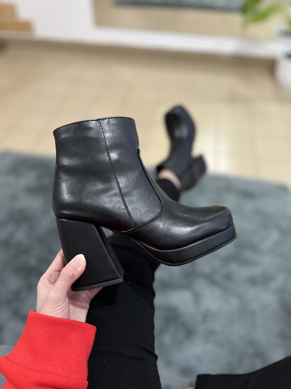 Botas confeccionadas en ecocuero con base de 1,5 cm. y taco de 8 cm. aproximadamente.