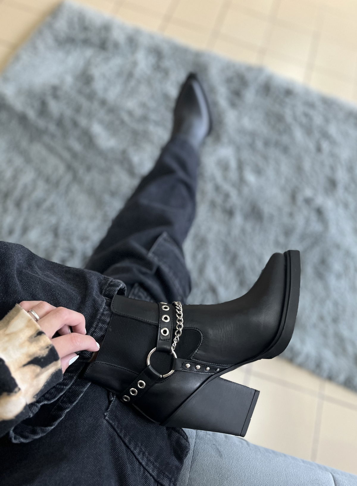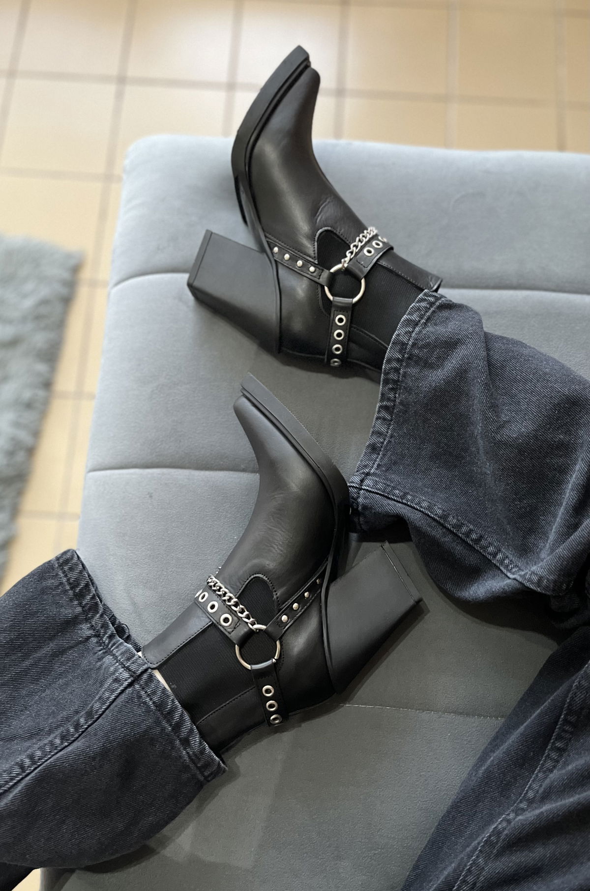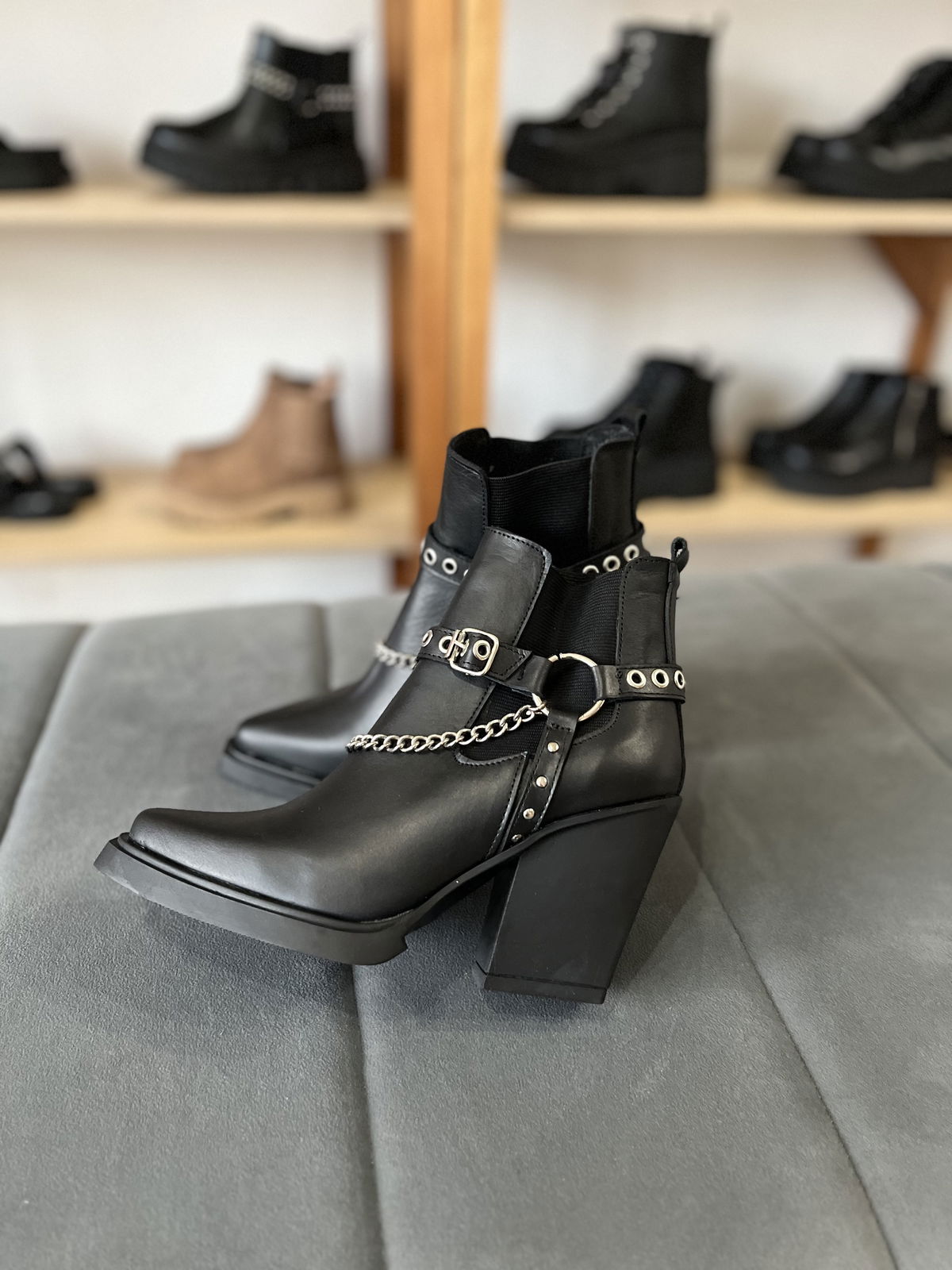 Contienen elásticos en ambos laterales y un estribo súper canchero de cadena, tachas y arandelas.