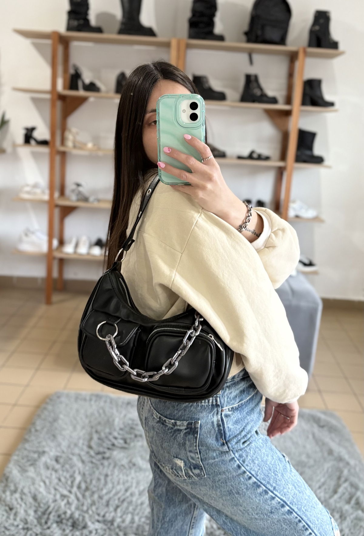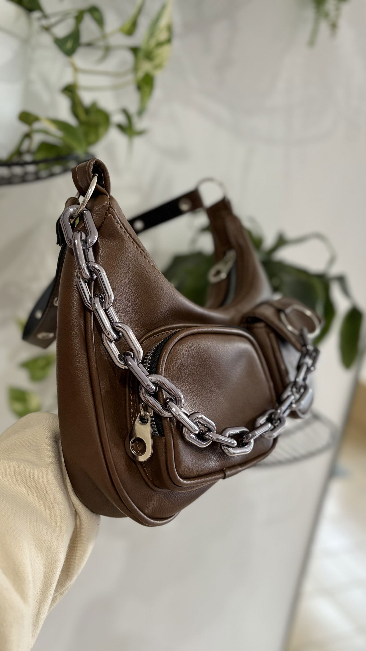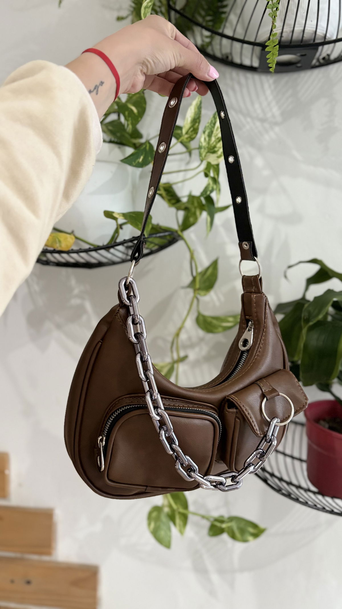 Mini bag de eco cuero con detalles de arandelas en la correa. Contiene cierre metálico, dos bolsillo externos y una cadena desmontable.
