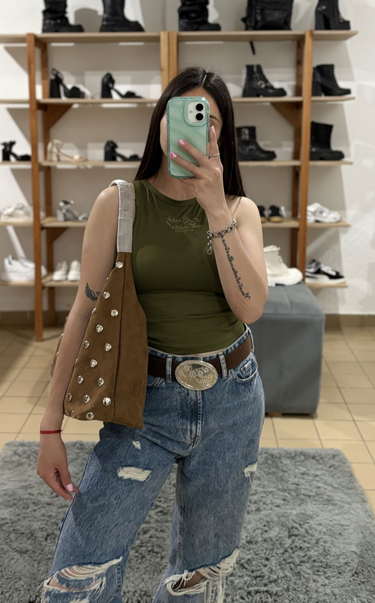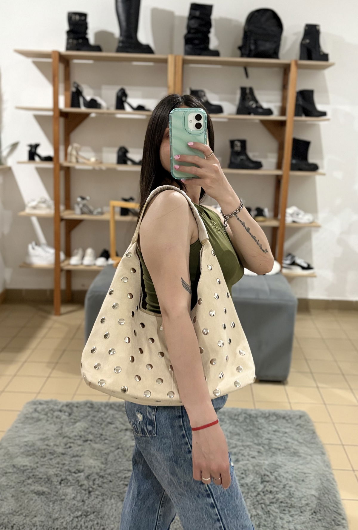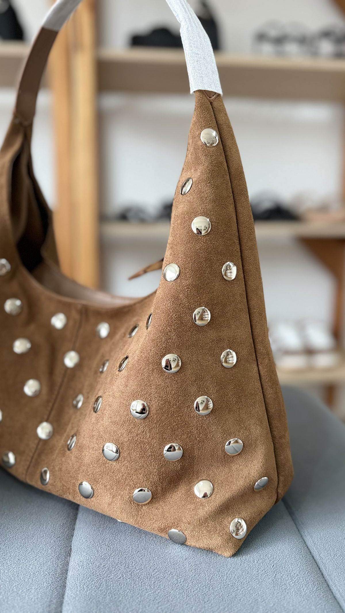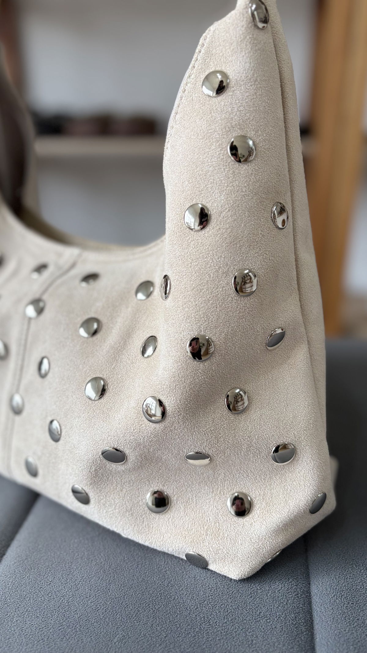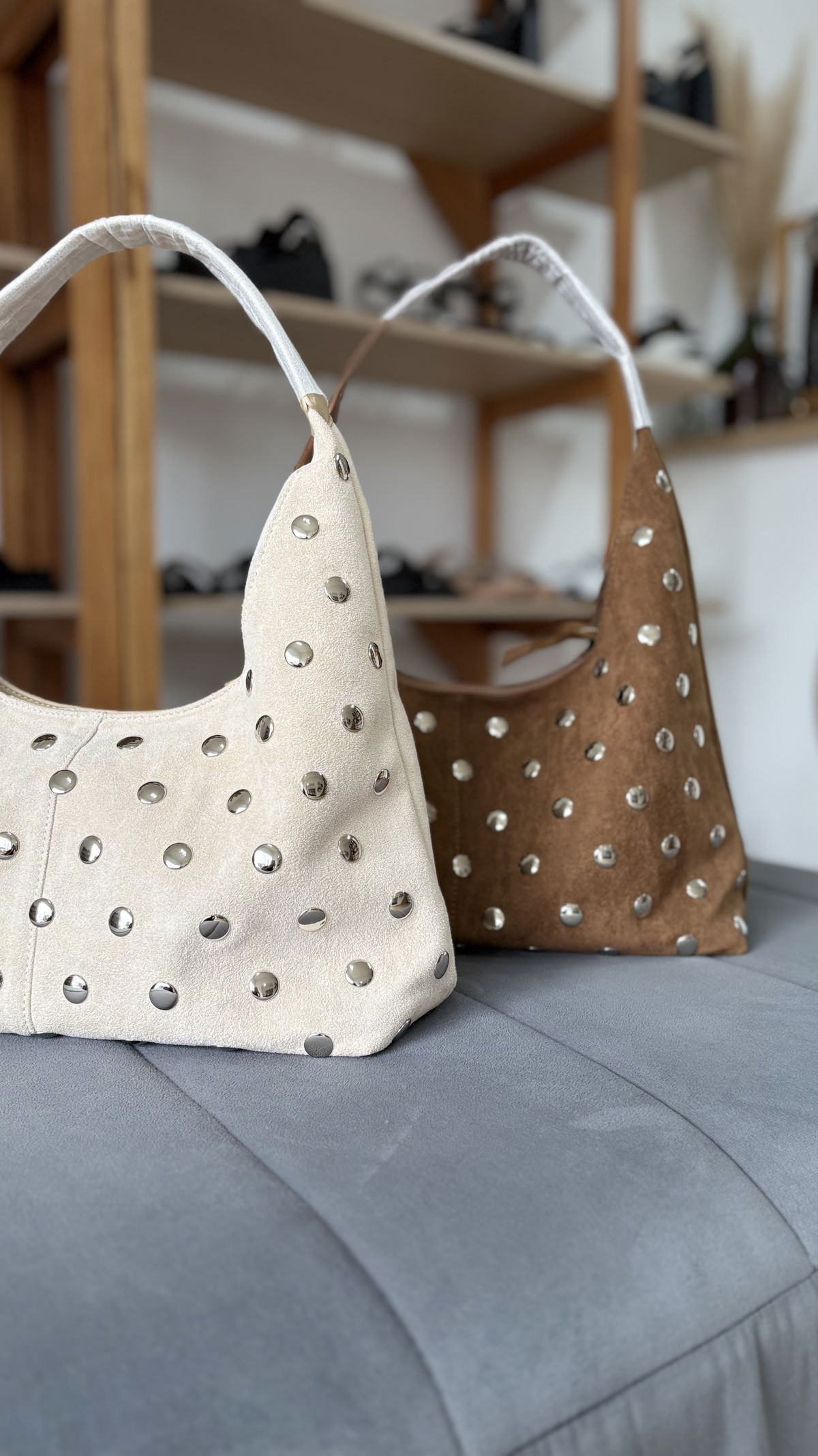 Cartera de gamuza con detalles de tachas, internamente forrada con dos bolsillos. Contiene cierre metálico.