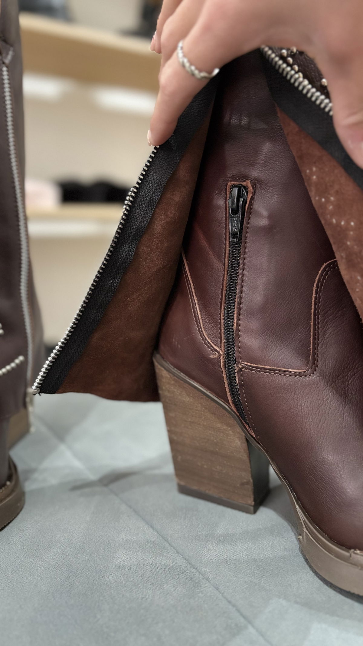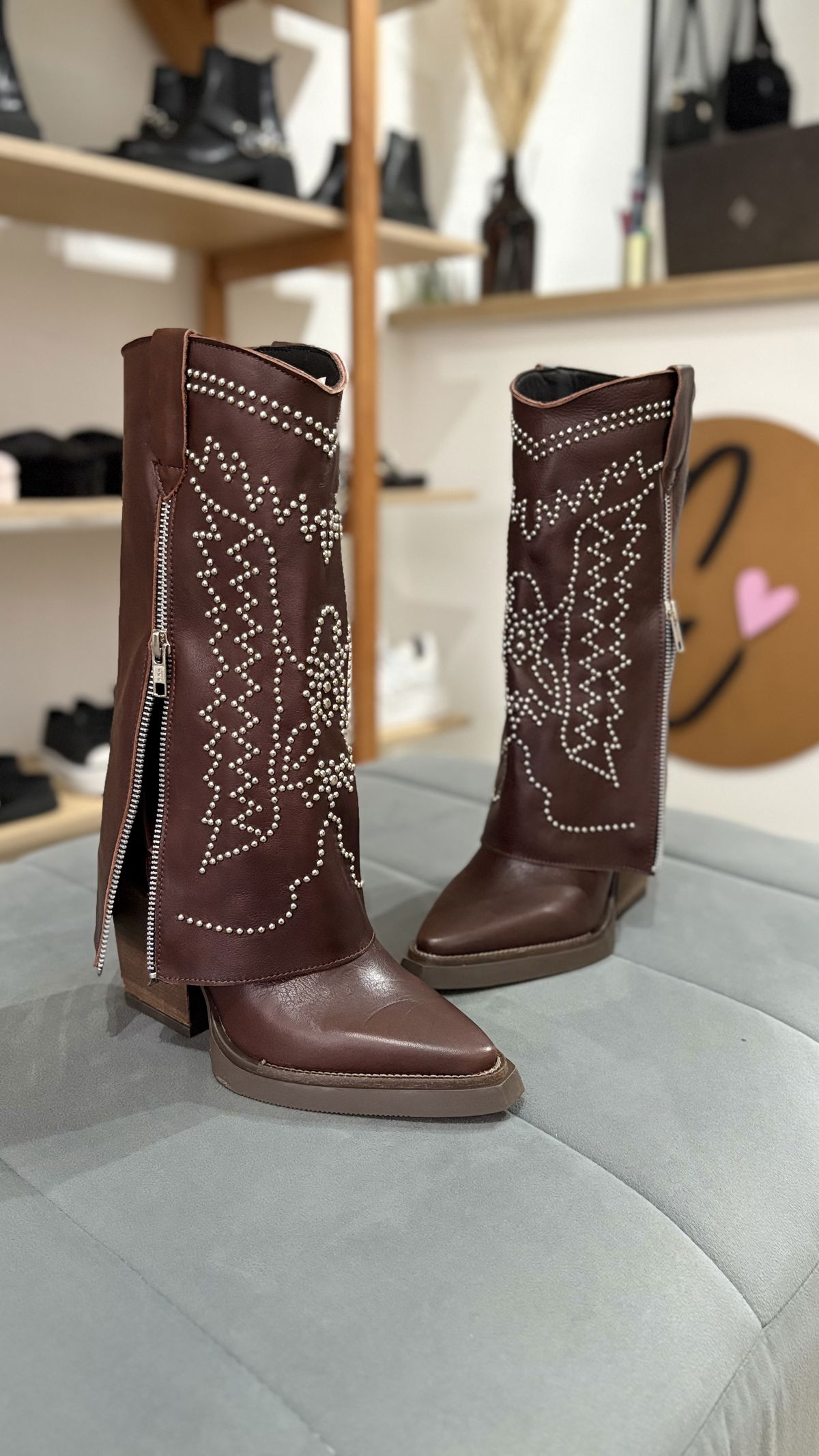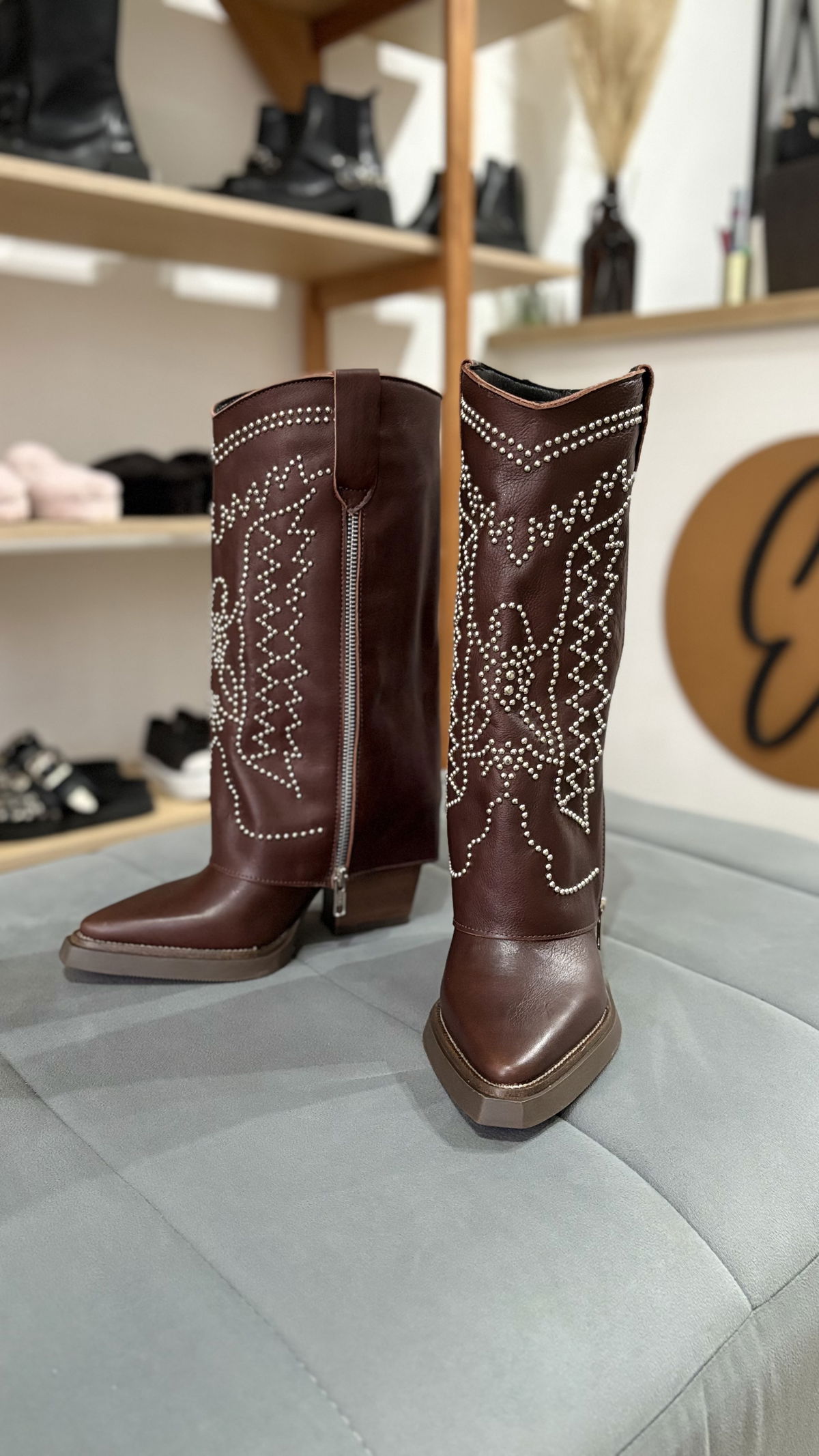 Texanas confeccionadas en 100% cuero, contienen pollera con doble cierre y detalles en tachas. Además incluye un cierre interno para más comodidad a la hora de calzarla.