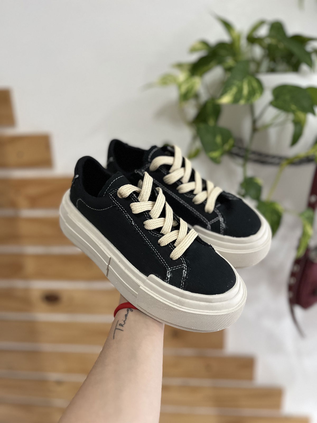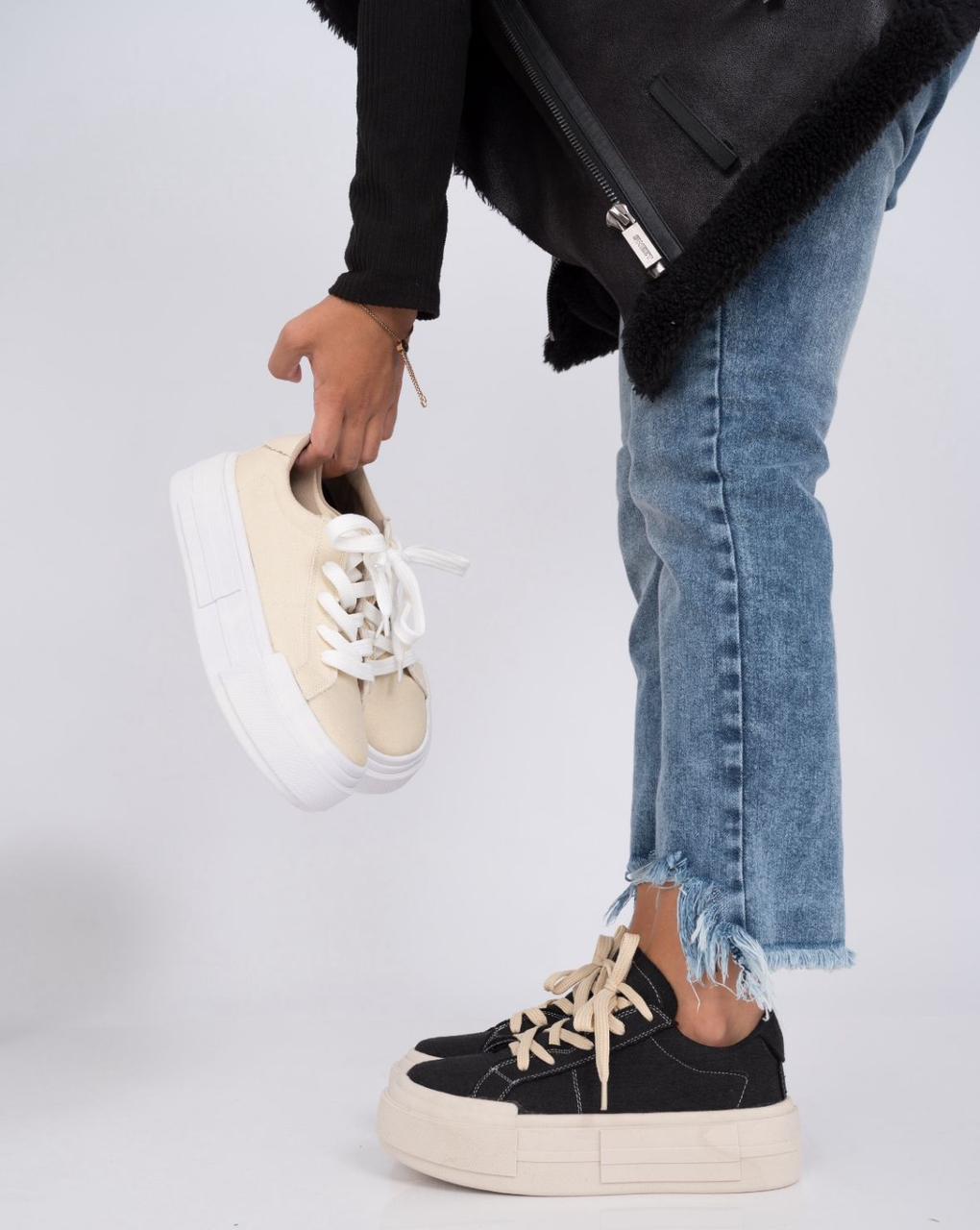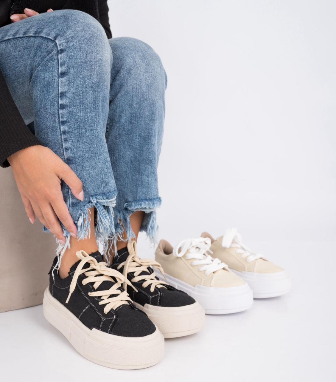 Estas zapatillas de lona combinan el negro y beige en un diseño moderno y versátil, perfectas para cualquier ocasión. Su plataforma de 4 cm te brinda ese extra de altura sin sacrificar comodidad, ideal para llevar todo el día con confianza.